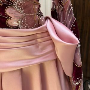 فستان أنيق بتصميم عربي للسيدات مصنوع من خامة بوليستر ناعمة، يمنح إطلالة راقية بانسيابية جذابة، تفاصيل أنيقة تضيف طابعاً شرقياً فاخراً، مناسب للسهرات والمناسبات ويعكس حضوراً واثقاً ومميزاً