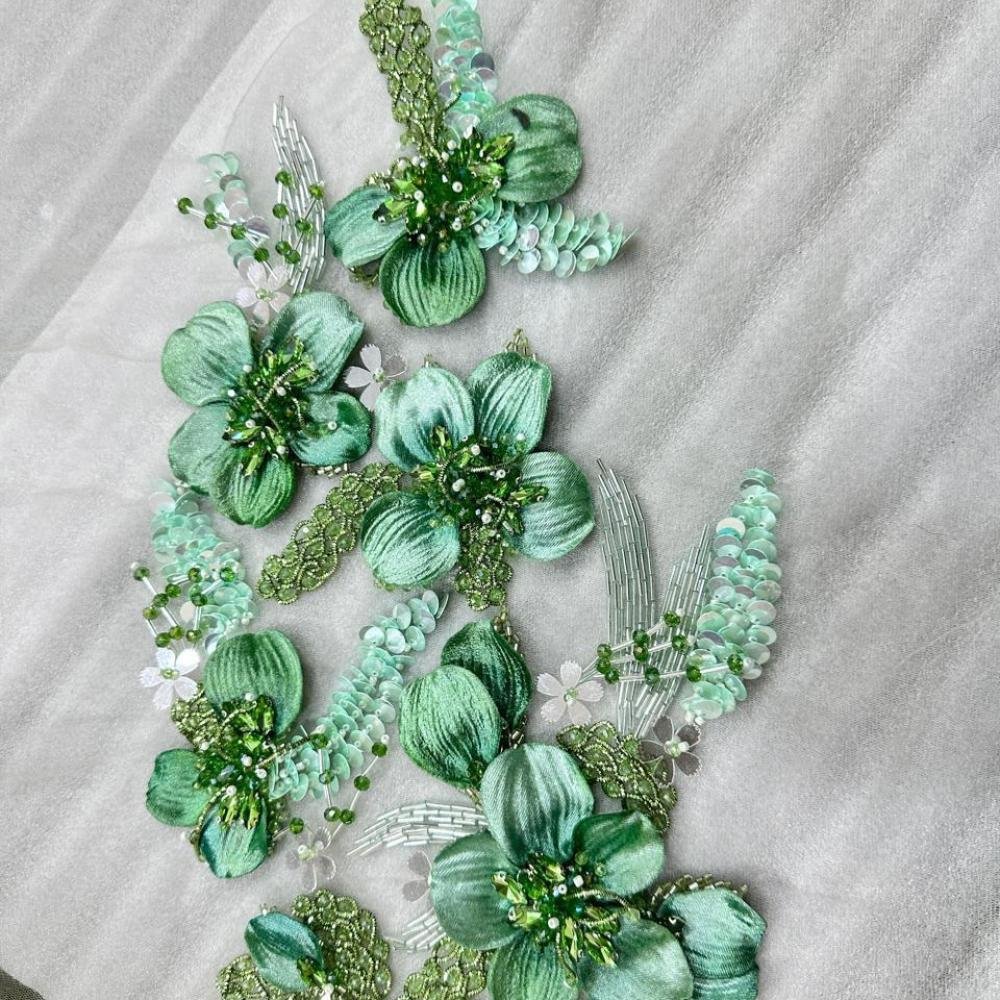 قطعة تطريز فاخرة تنبض بالانتعاش والأناقة، بتصميم مستوحى من الطبيعة يعكس جمال الزهور المتفتحة بدرجات الأخضر الناعمة والمنعشة. تتناغم الألوان بين الأخضر الفاتح والنعناعي مع لمسات شفافة لؤلؤية، لتمنح إحساسًا بالنقاء والرقي.