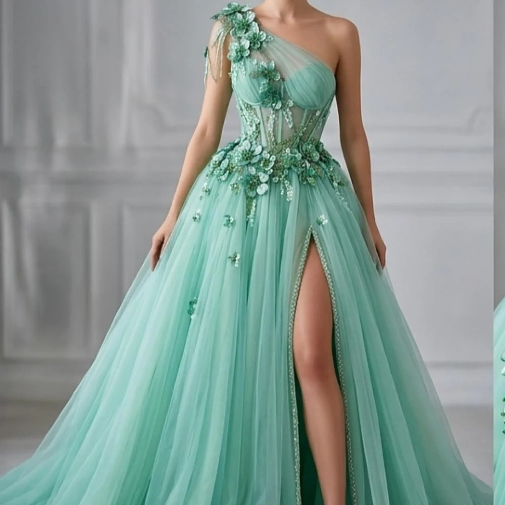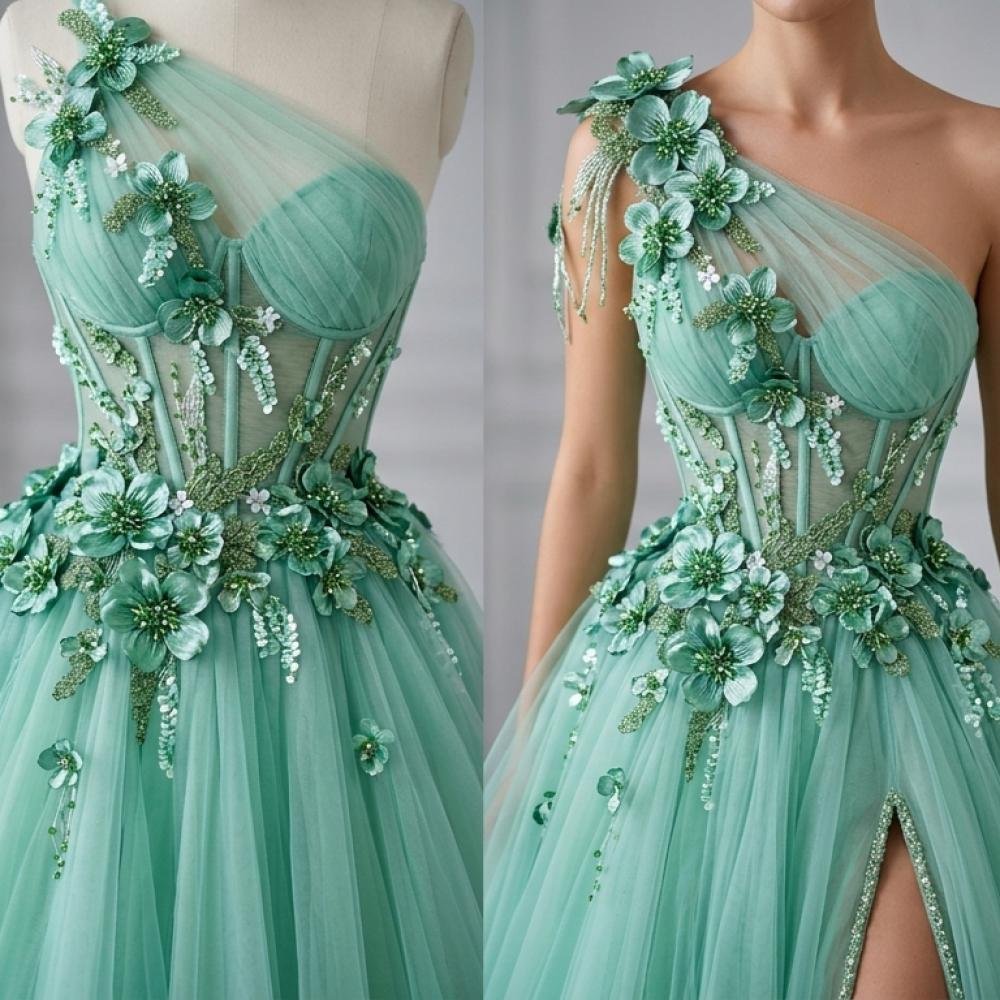 تتميز بزهور ثلاثية الأبعاد بملمس حريري غني، تتوسطها تفاصيل دقيقة من الخرز والكريستال تضيف بريقًا راقيًا، بينما تتوزع عناصر الترتر الشفاف والخيوط المطرزة بانسجام لتخلق تأثيرًا ضوئيًا ناعمًا وجذابًا. كما تضيف التكوينات الدقيقة من الخرز الطولي والشبكي لمسة عصرية مميزة تعزز فخامة التصميم.