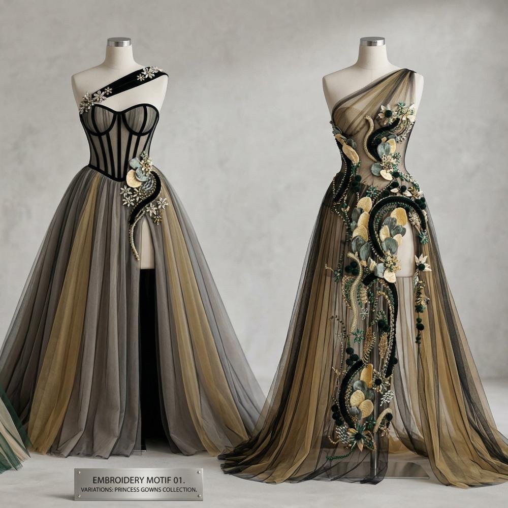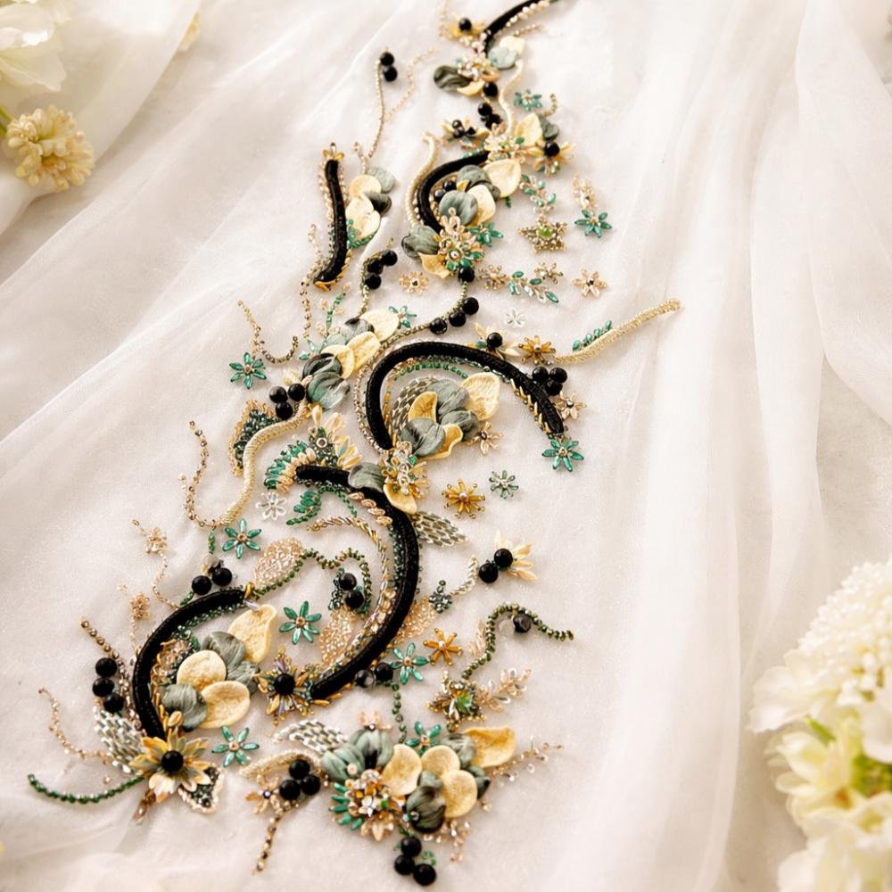 قطعة تطريز فاخرة بتصميم فني راقٍ وتفاصيل دقيقة تجمع بين الأحجار والخرز بألوان زمردي، أسود وذهبي، تعكس أناقة لافتة ولمسة عصرية مميزة. تتميز بسهولة القص والتشكيل لتناسب مختلف التصاميم، وتُعد خيارًا مثاليًا لفساتين السهرات والمناسبات الخاصة ✨