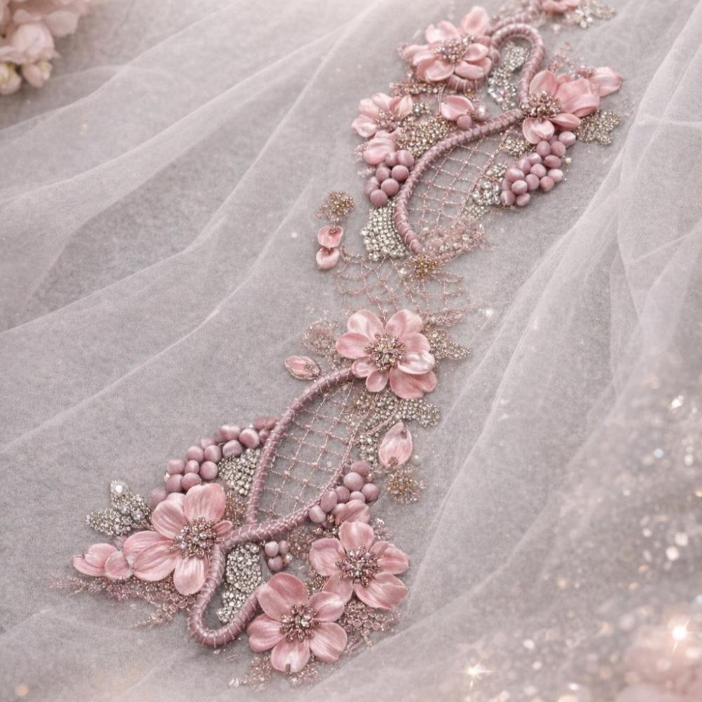 قطعة تطريز فاخرة بتصميم أنثوي راقٍ، تنسج تفاصيلها بحرفية عالية من ورود ناعمة وتطريزات لامعة بألوان وردي هادئ ولمسات فضية جذابة، لتمنح أي تصميم لمسة فخامة وأناقة لا تُقاوم.