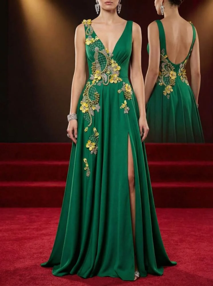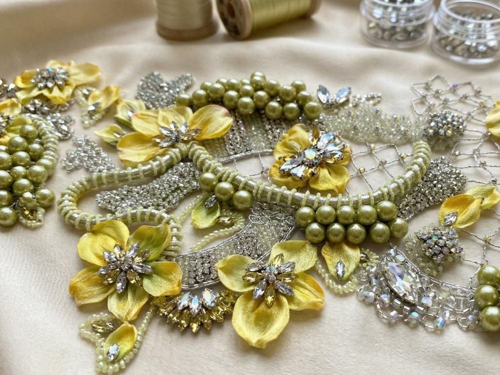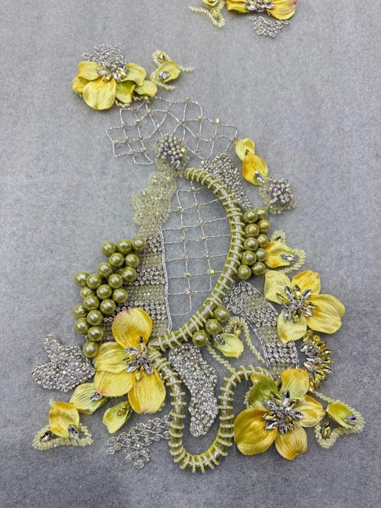 تتداخل الخامات الفاخرة ببراعة؛ من بتلات قماشية ناعمة ثلاثية الأبعاد، إلى تطريز دقيق بالخرز والكريستال بأشكال متعددة ولمعان متدرج، إضافة إلى عناصر لامعة متعددة الألوان تعكس الضوء بحيوية وتمنح القطعة بعدًا بصريًا غنيًا ومترفًا. كما تنسدل الأغصان المطرزة بخفة لتمنح إحساسًا بالحركة الطبيعية والجاذبية.