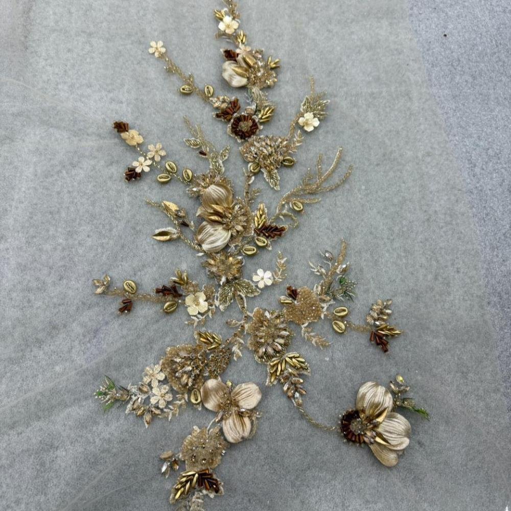 قطعة تطريز فاخرة بتصميم نباتي انسيابي، تجسد مزيجًا راقيًا من الأناقة الكلاسيكية واللمسة العصرية. تتألق بتفاصيل دقيقة من الزهور ثلاثية الأبعاد المصنوعة من خامات ناعمة مع تطريز متقن بخيوط ذهبية، ينساب بتناغم مع حبات الخرز والكريستال ليمنح لمعانًا جذابًا وحضورًا فاخرًا.