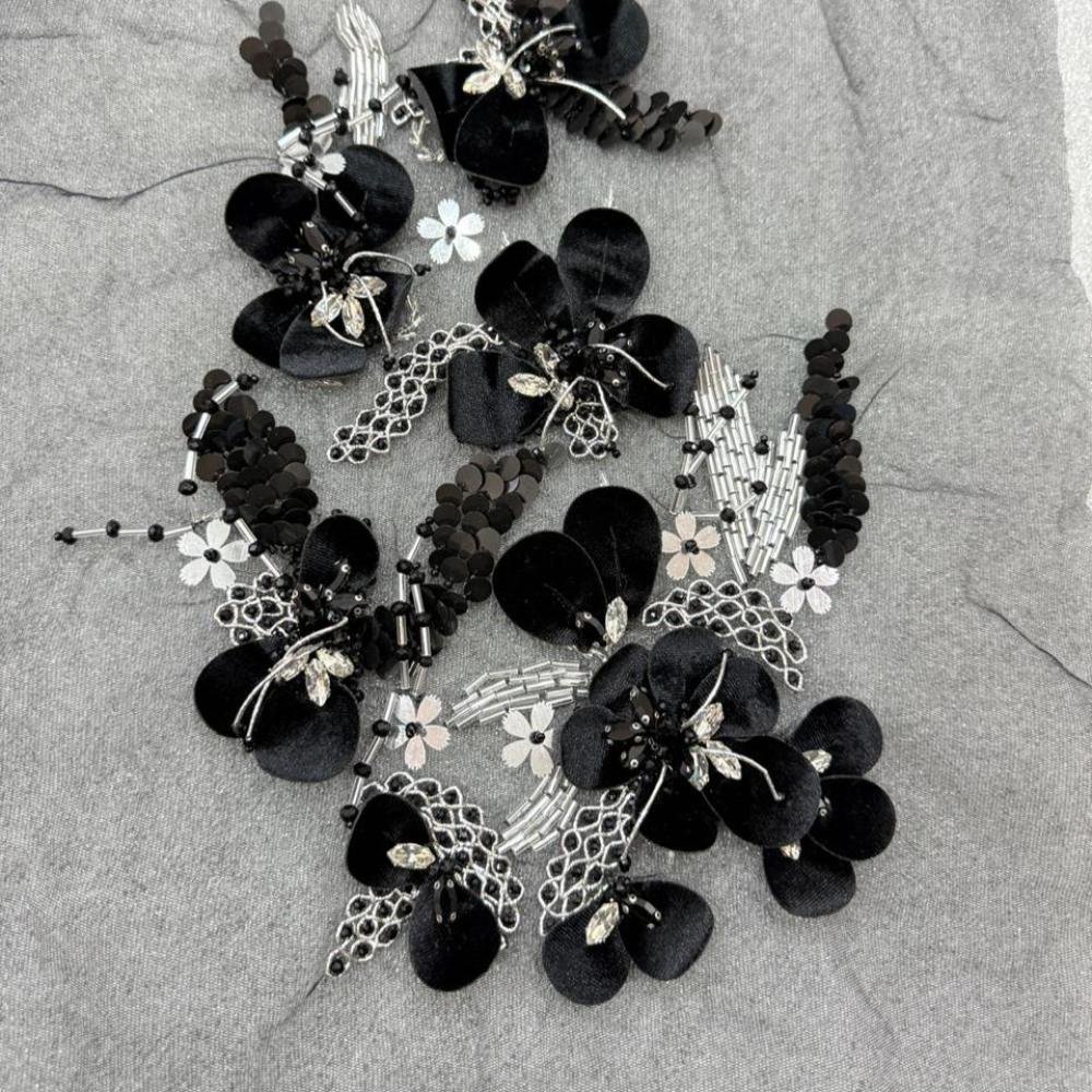 قطعة تطريز راقية بتصميم جريء يجسد فخامة اللون الأسود بأسلوب عصري أنيق، حيث تتفتح الزهور ثلاثية الأبعاد بملمس مخملي ناعم يمنح إحساسًا غنيًا وملفتًا يعكس قوة وأناقة الإطلالة.