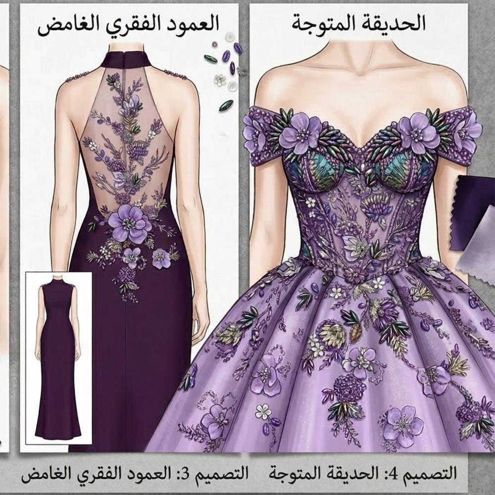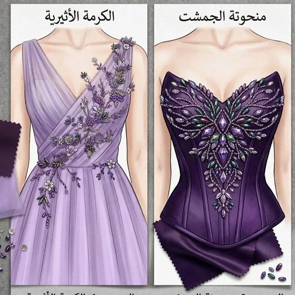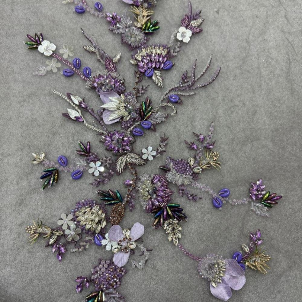 قطعة تطريز استثنائية تنبض بالفخامة والأنوثة، بتصميم متناغم مستوحى من الطبيعة حيث تتفتح الزهور بتدرجات بنفسجية ساحرة تتراوح بين الليلكي الهادئ والبنفسجي العميق، في تناغم لوني يلفت الأنظار ويمنح التصميم طابعًا عصريًا راقيًا.