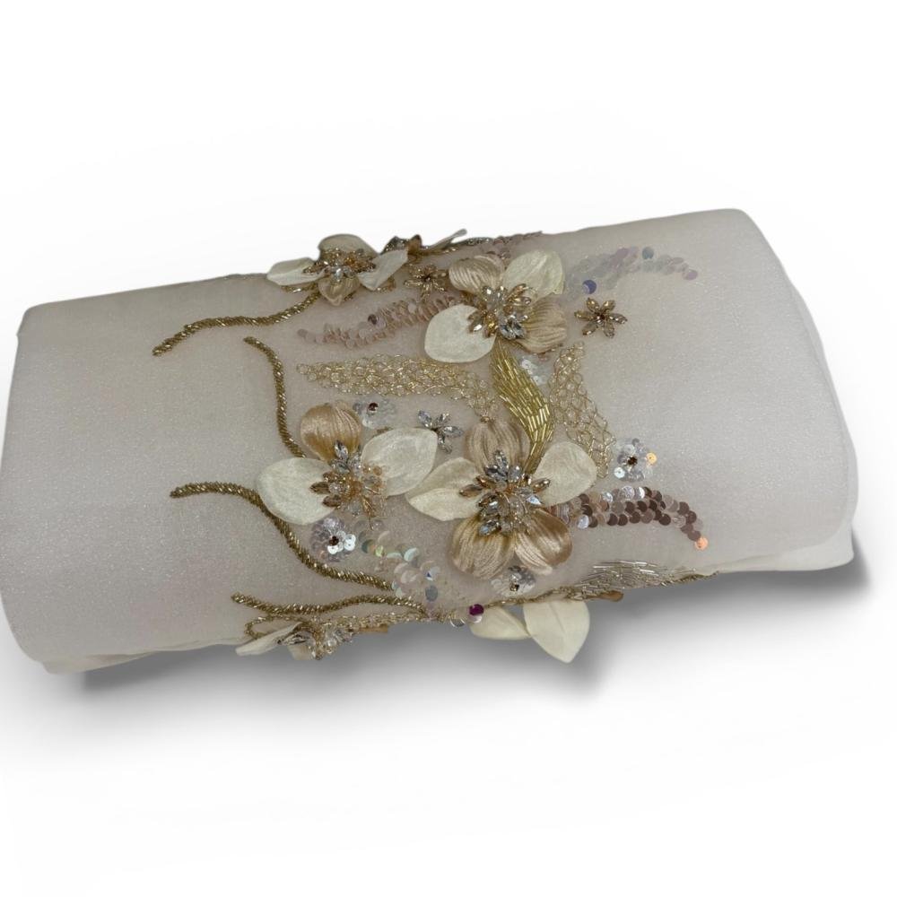 هذا البانو صُمّم بذوقٍ هادئ يعشق التفاصيل، حيث تتفتح الزهور بلون العاج والشمبانيا فوق خامة شفافة ناعمة، وتنساب الخيوط الذهبية والترتر اللامع بخفة ليمنح القطعة إشراقًا أنثويًا راقيًا دون مبالغة.