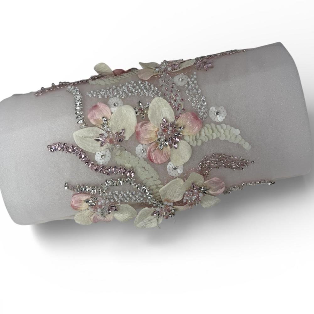 يأتي هذا البانو المطرّز على خامة شفافة حريرية بلون عاجي مضيء، تتفتح عليه أزهار وردية شفافة بتفاصيل متدرجة، مطعّمة بخيوط فضية لامعة ولمسات خرزية دقيقة تعكس الضوء برقة ساحرة.