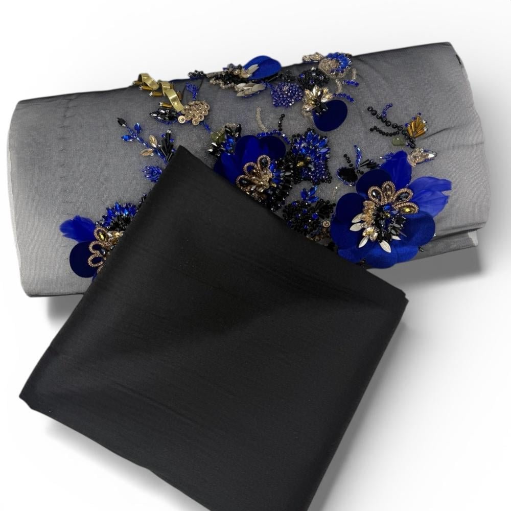 بانو استثنائي بتدرجات الأزرق الملكي العميق، يتألق فوق خامة شفافة رمادية راقية، حيث تتناغم الزهور القماشية مع الخرز الأسود، الذهبي، ولمسات الكريستال اللامعة لتخلق حضورًا قويًا وفخمًا.