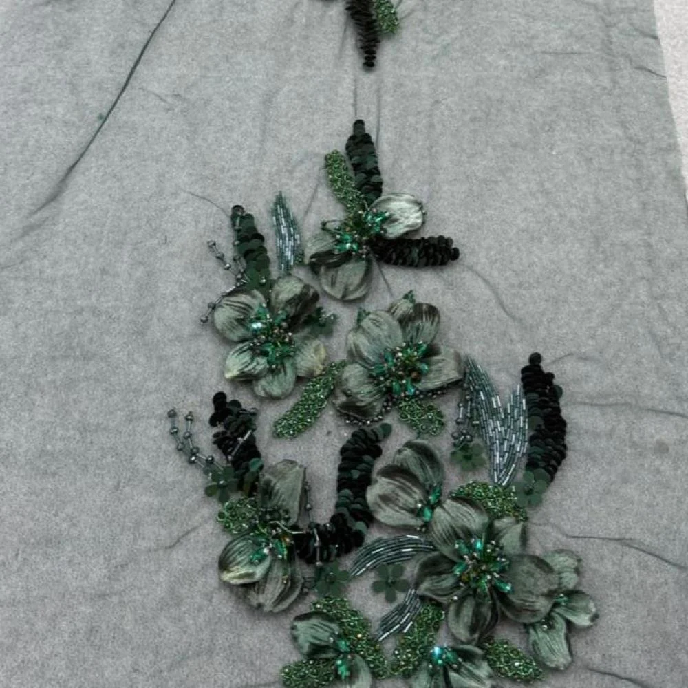 قطعة تطريز فاخرة على قماش شفاف بلون أخضر داكن، بتصميم انسيابي مزين بزهور ثلاثية الأبعاد بتدرجات زمردية راقية. مزودة بتفاصيل دقيقة من الخرز والترتر والكريستال تمنح لمعانًا جذابًا ولمسة فخمة، مثالية لتفصيل فساتين السهرة والمناسبات الراقية.