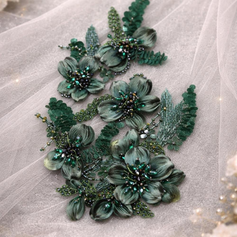 قطعة تطريز فاخرة تنبض بالفخامة والتفاصيل الآسرة، بتدرجات الأخضر العميق التي تعكس روح الأناقة والرقي. تناغم ساحر بين الورود المطرزة والخرز اللامع يخلق تصميمًا حيويًا يلفت الأنظار من أول لمسة.