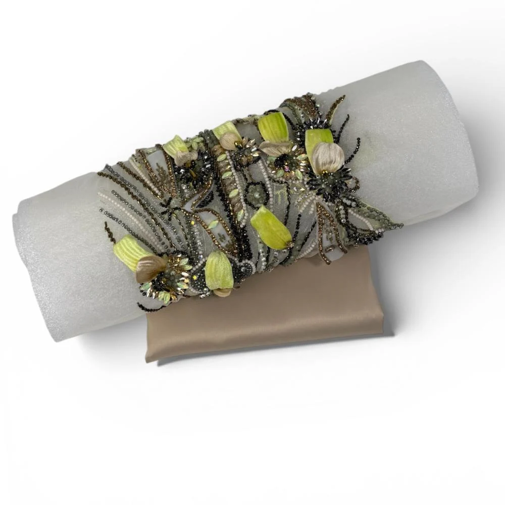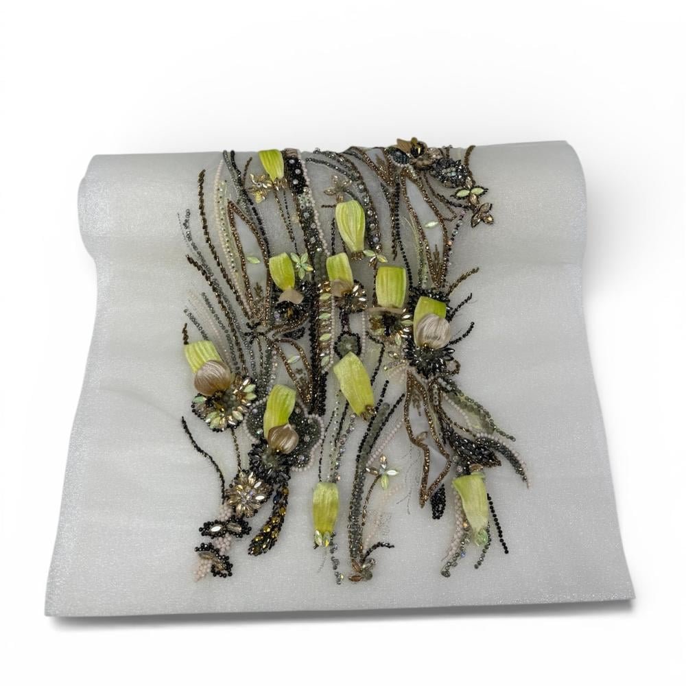 قطعة بانو راقية بتطريز يدوي متقن على قاعدة شفافة بلون فضي هادئ، مزينة بعناصر نباتية متداخلة بدرجات الأخضر الليموني، الزيتي، والذهبي الداكن. تصميم غني بالتفاصيل يمنح القطعة طابعًا فخمًا وحضورًا لافتًا، مثالي لإبراز جمال التصاميم الراقية.