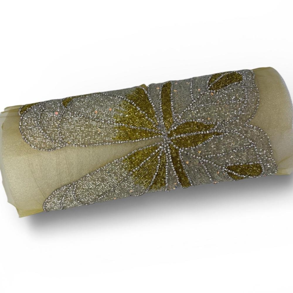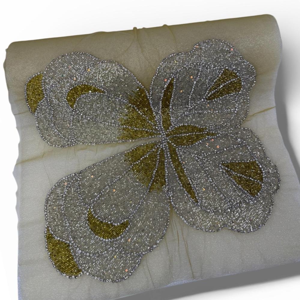 قماش سهرة فاخر يجمع بين الرقي والنعومة، صُمم بعناية ليمنح تصاميم السهرة لمسة فخامة مميزة. يتميز بتطريز أنيق على شكل زهرة متناغمة بخيوط لامعة عالية الجودة وتفاصيل دقيقة تعكس الضوء برقي، ليضفي بريقًا ناعمًا وغير مبالغ فيه. القماش الأساسي خفيف وشفاف بانسيابية راقية، ومرفق بقطعة ساتان بلون ذهبي دافئ تكمل التصميم وتمنح الفستان عمقًا وأناقة إضافية.