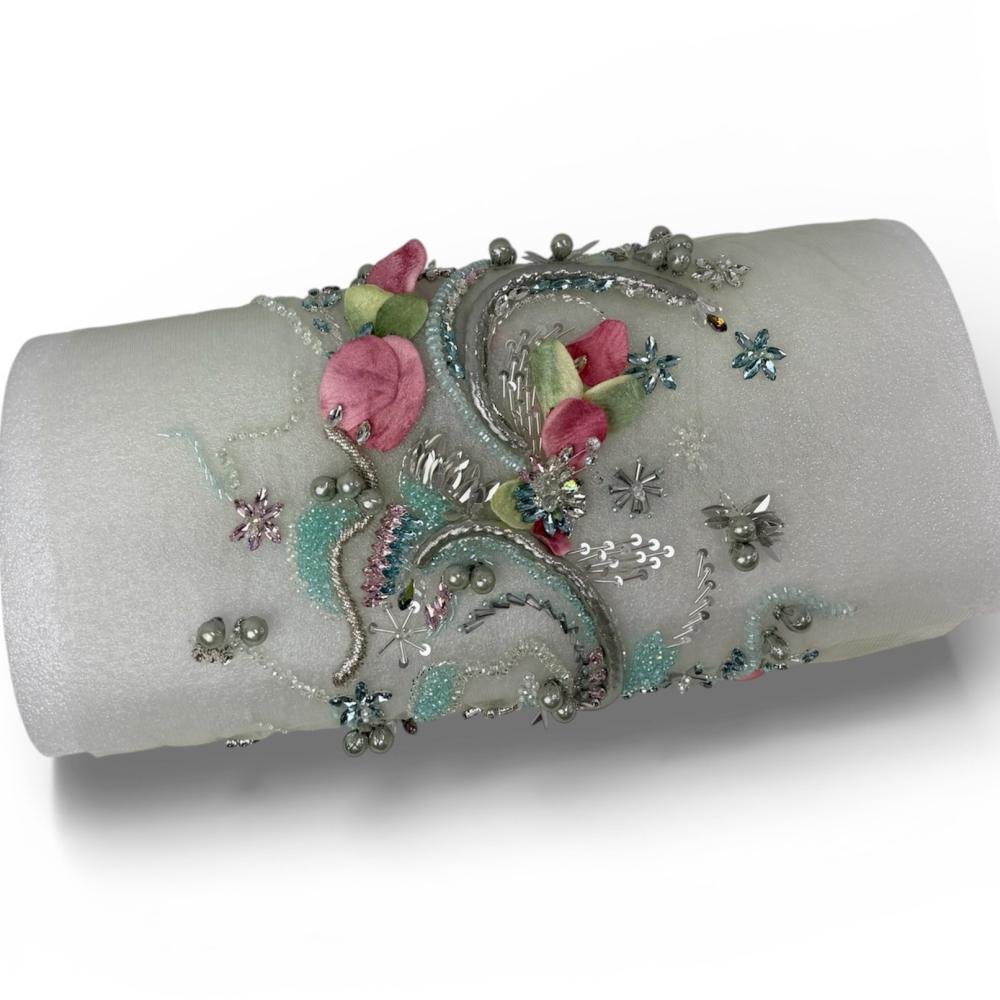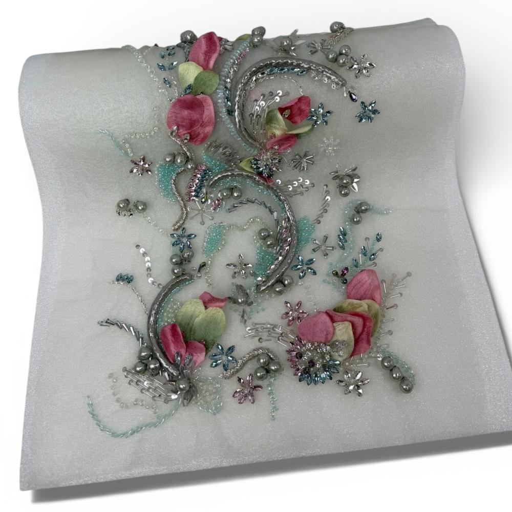 هذا القماش من القطع اللي تلفت النظر بهدوء، لونه أساسه عاجي فاتح مع لمسة فضية ناعمة، ومطرز بتفاصيل زهرية ثلاثية الأبعاد بألوان وردية ونعناع هادئة تعطيه إحساس رقيق ومريح للعين. التطريز موزّع بانسيابية مع خرز وأحجار لامعة تضيف لمعة خفيفة بدون مبالغة، والنتيجة قطعة أنيقة تناسب الذوق الناعم والفخم بنفس الوقت.