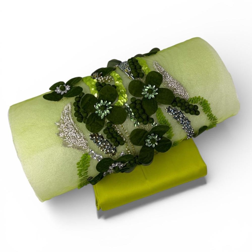 التطريز بارز ومتقن، يجمع بين الخرز والترتر والتفاصيل المعدنية اللامعة، ليمنح القماش عمقًا وحضورًا فخمًا بدون أي مبالغة. كل تفصيلة فيه تخدم التصميم وتكمله، مما يجعله خيارًا مثاليًا للقطع المميزة التي تعتمد على الأناقة الهادئة.