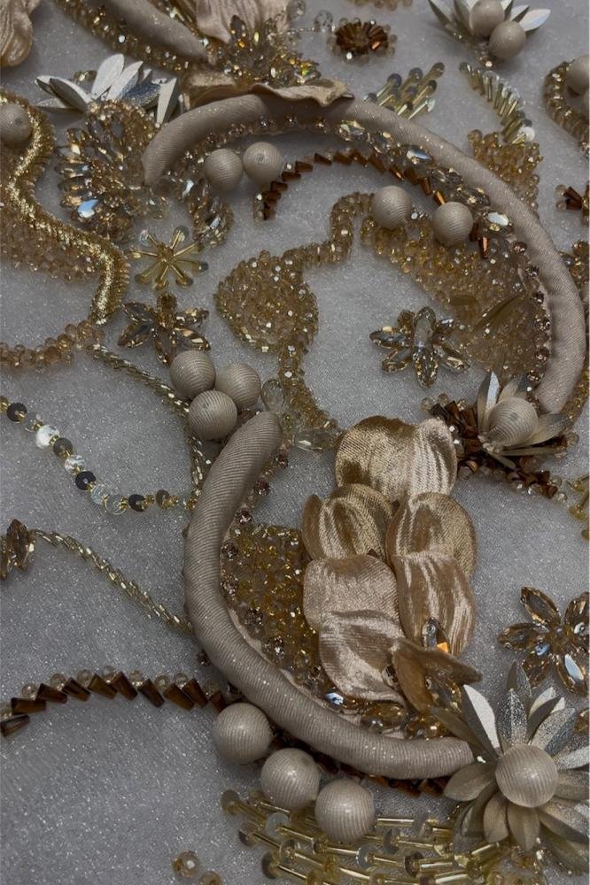 قماش تول شفاف مطرز يدويًا بتفاصيل متقنة من الكريستال، الخرز، واللؤلؤ مع ورود ثلاثية الأبعاد بتدرجات شامبين وذهبي تمنح التصميم إشراقة فاخرة.