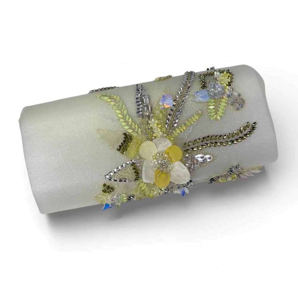 ألوان التطريز بين الأصفر الليموني، الأخضر الفاتح، الفضي، ولمسات لؤلؤية ناعمة، كلها متناغمة وتناسب التصاميم الهادئة والفخمة في الوقت نفسه.