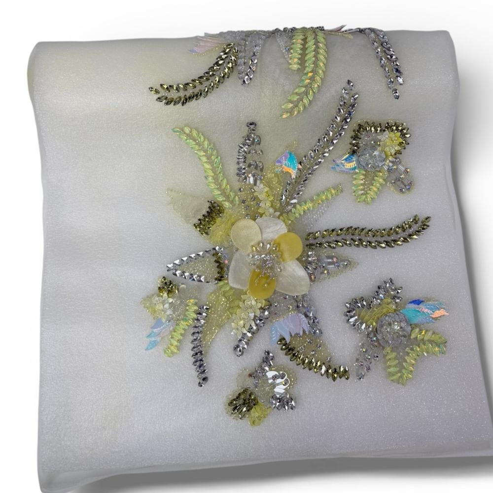 النقش يعتمد على توزيع زهري حر بأغصان وأوراق متفرقة، تتوسطه زهرة بارزة تعطي توازنًا وجاذبية للتصميم. التطريز منفّذ باستخدام خرز كريستالي لامع وترتر معدني فضي وذهبي مع تفاصيل من خرز شفاف وأحجار عاكسة للضوء، ما يمنح البانو بريقًا خفيفًا يظهر بشكل جميل مع الحركة.