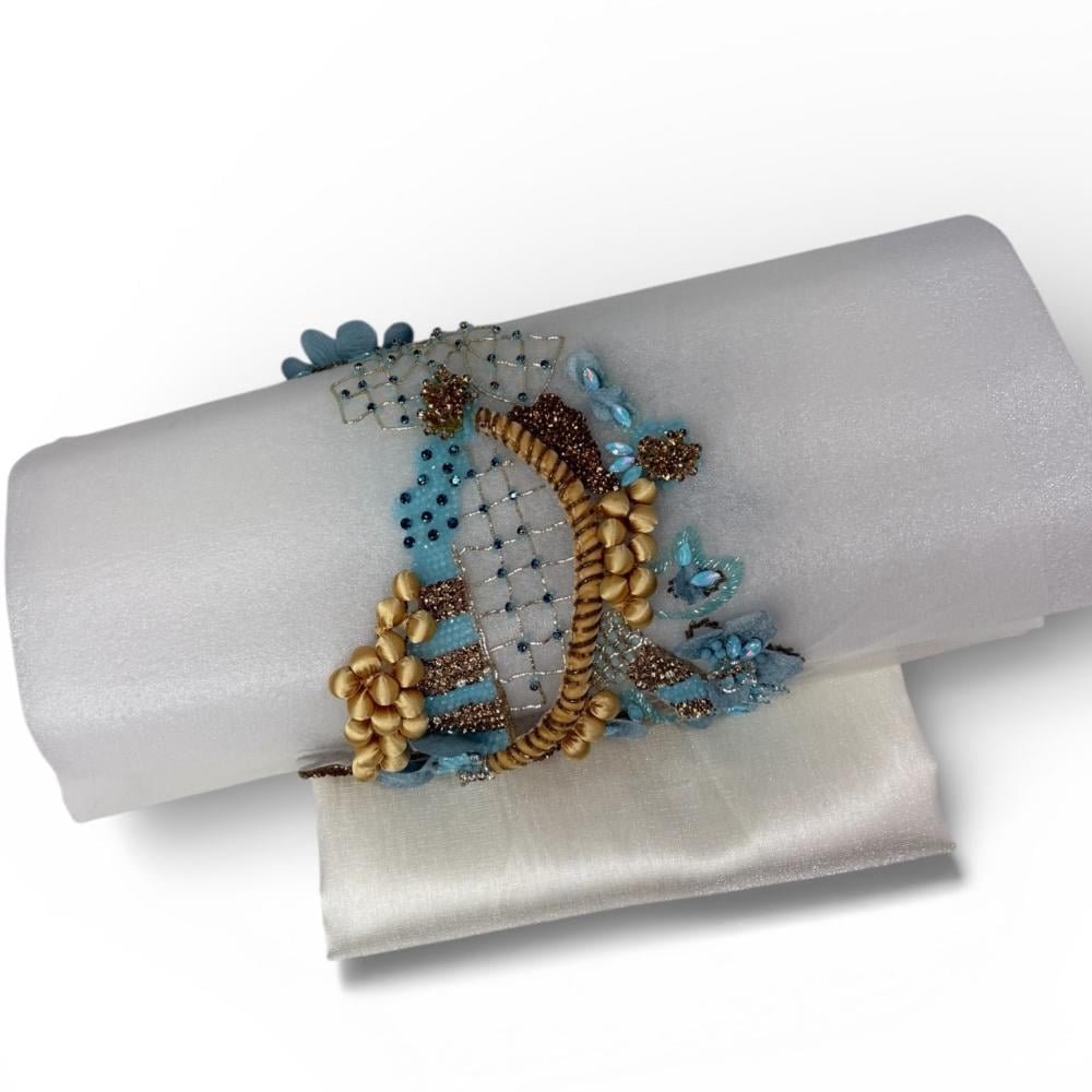 يتميّز البانو برسمة متداخلة بخطوط منحنية ناعمة، تتوسطها تطريزات دقيقة بدرجات الأزرق السماوي والتركوازي مع لمسات ذهبية دافئة تضيف عمقًا وأناقة استثنائية. الزهور ثلاثية الأبعاد والخرز اللامع والخرز اليدوي المتقن تشكّل لوحة متناغمة تعكس فخامة التفاصيل وجودة التنفيذ.