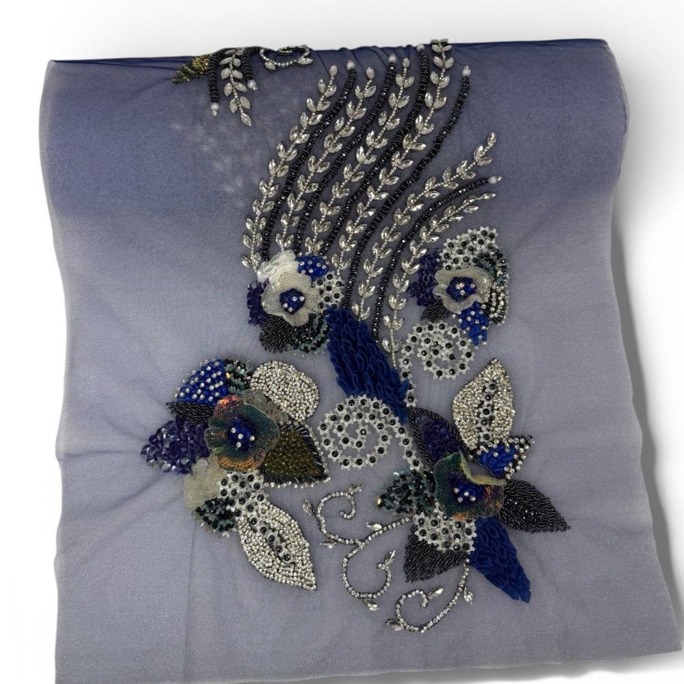 ألوان التطريز تجمع بين الأزرق الليلي، الفضي الهادئ، ولمسات داكنة عميقة، ما يمنح البانو طابعًا رومنسيًا يناسب فساتين السهرة الفخمة والمناسبات الخاصة.