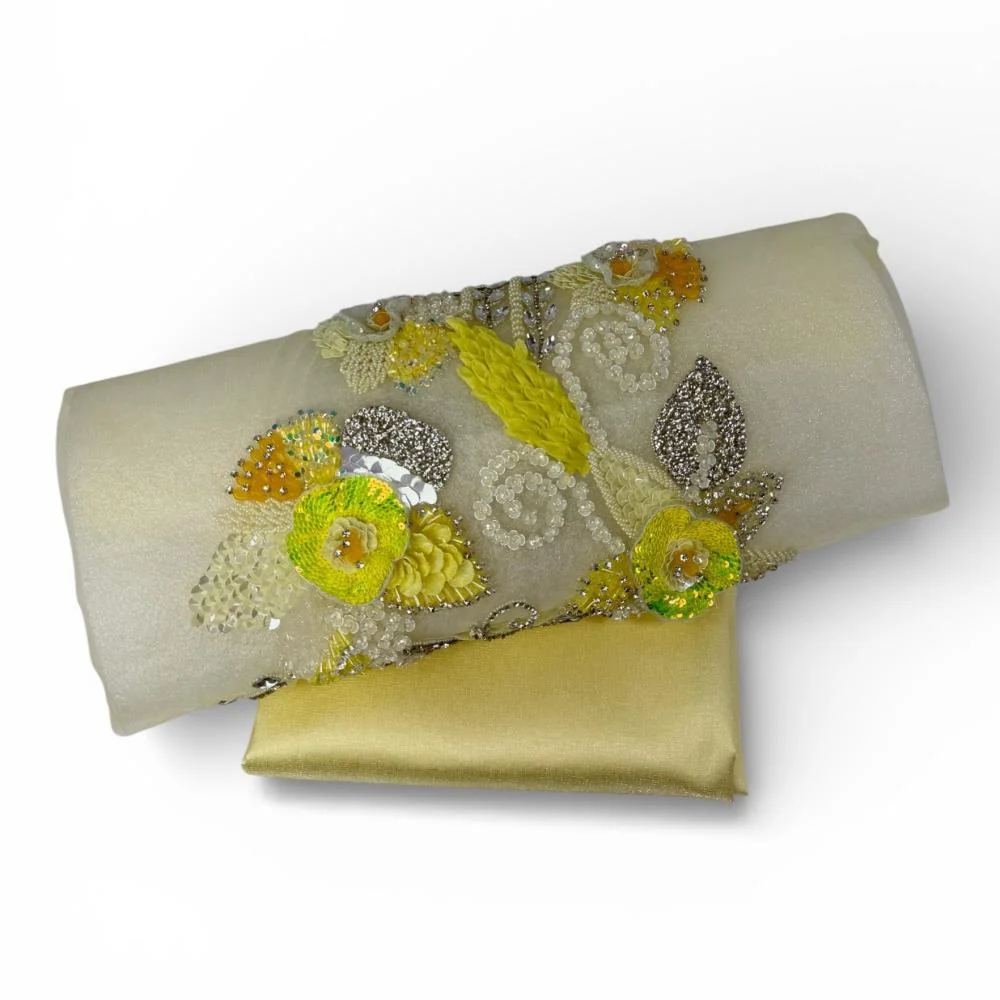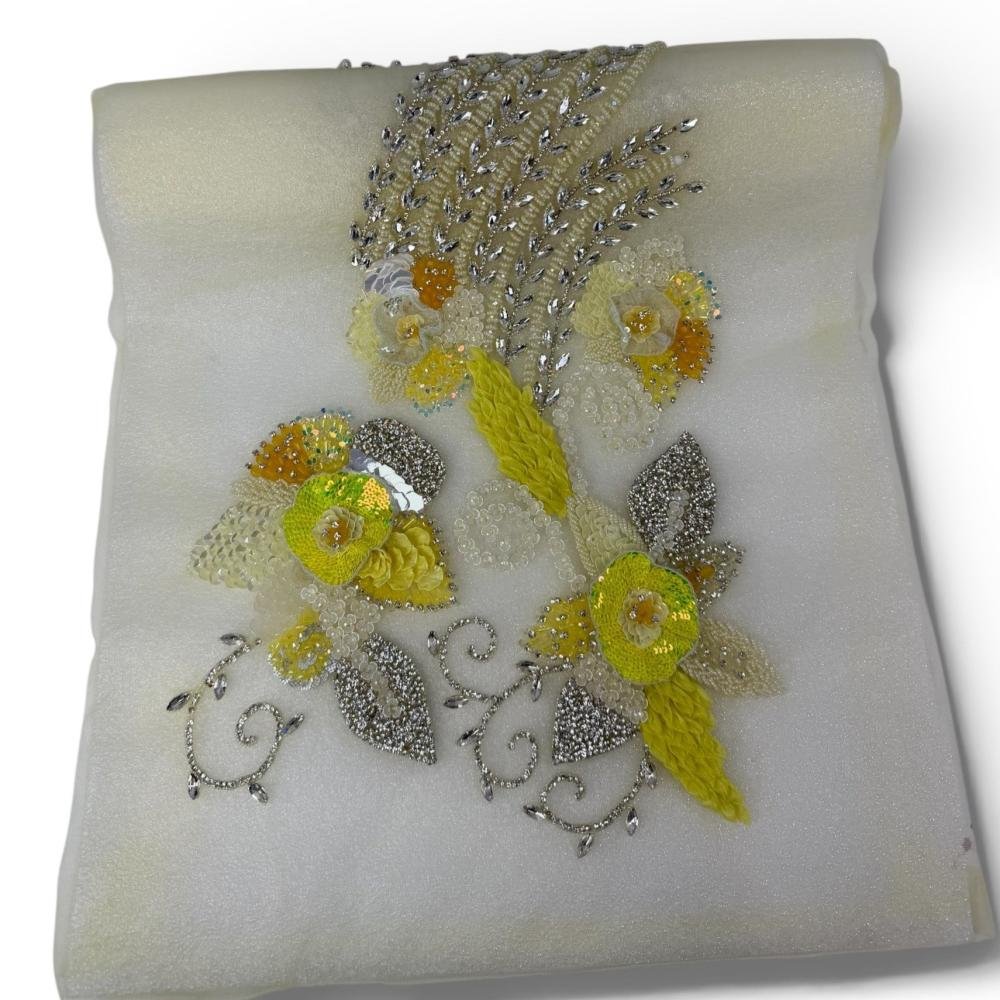 النقش الزهري يأتي بتوزيع متوازن يميل للانسياب، تتداخل فيه الأغصان المتلألئة مع الزهور البارزة، ليخلق لوحة فنية هادئة ذات طابع أنثوي جذاب. التطريز منفّذ بدقة باستخدام خرز كريستالي لامع، خرز أسود وأزرق داكن، وترتر فضي يعكس الضوء برقي دون مبالغة.