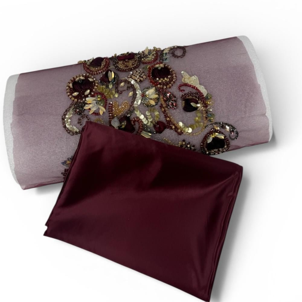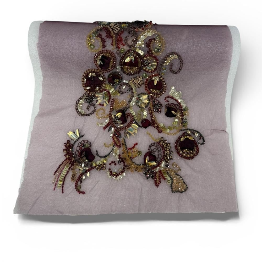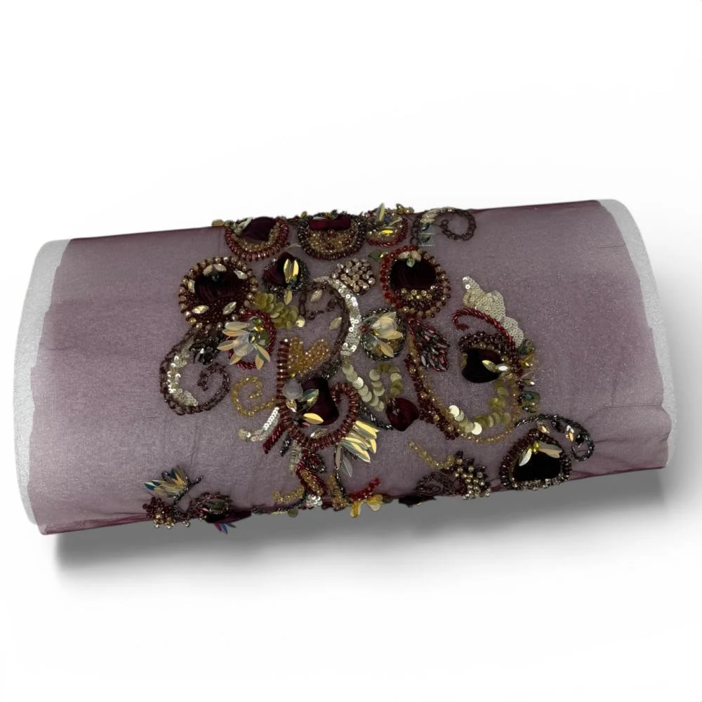 بانو تطريز فاخر على خامة شفافة ناعمة بلون موف هادئ، مزدان بزخارف فنية متداخلة بتدرجات العنّابي والذهبي مع لمسات لامعة من الخرز والترتر والكريستال، تمنح التصميم عمقًا بصريًا وحضورًا قويًا يلفت الأنظار.