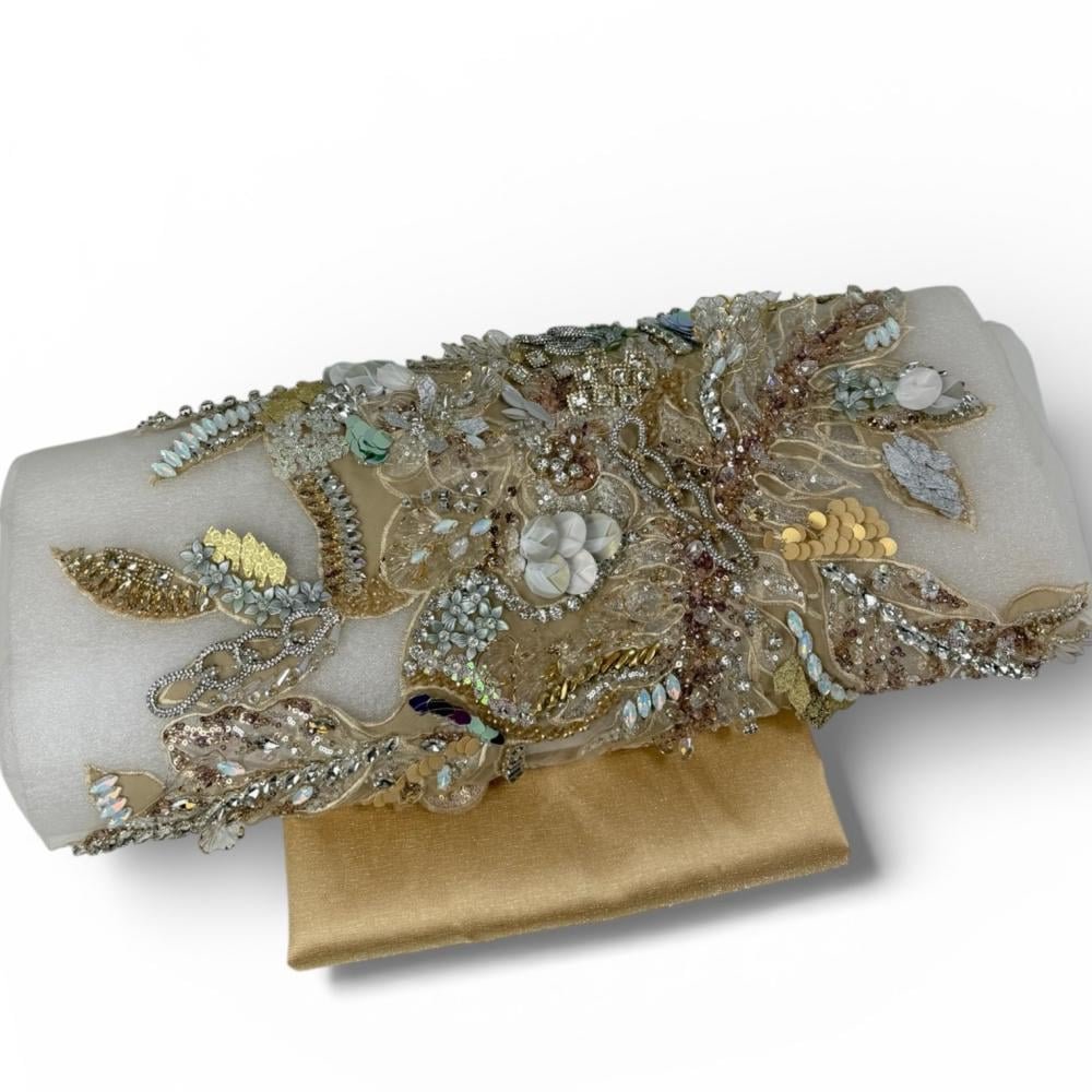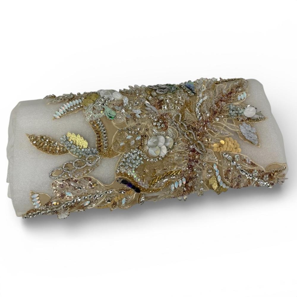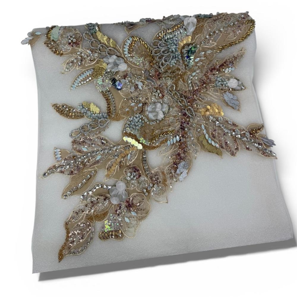 قطعة تطريز فاخرة على قماش تول ناعم بلون عاجي راقٍ، تنبض بالفخامة من أول نظرة. تصميم غني مستوحى من أوراق الزهور المتفتحة، منفّذ بتطريز يدوي عالي الدقة يجمع بين الخرز الكريستالي، الترتر اللامع، الأحجار الدقيقة، ولمسات ثلاثية الأبعاد تمنح القطعة عمقًا وأناقة استثنائية.