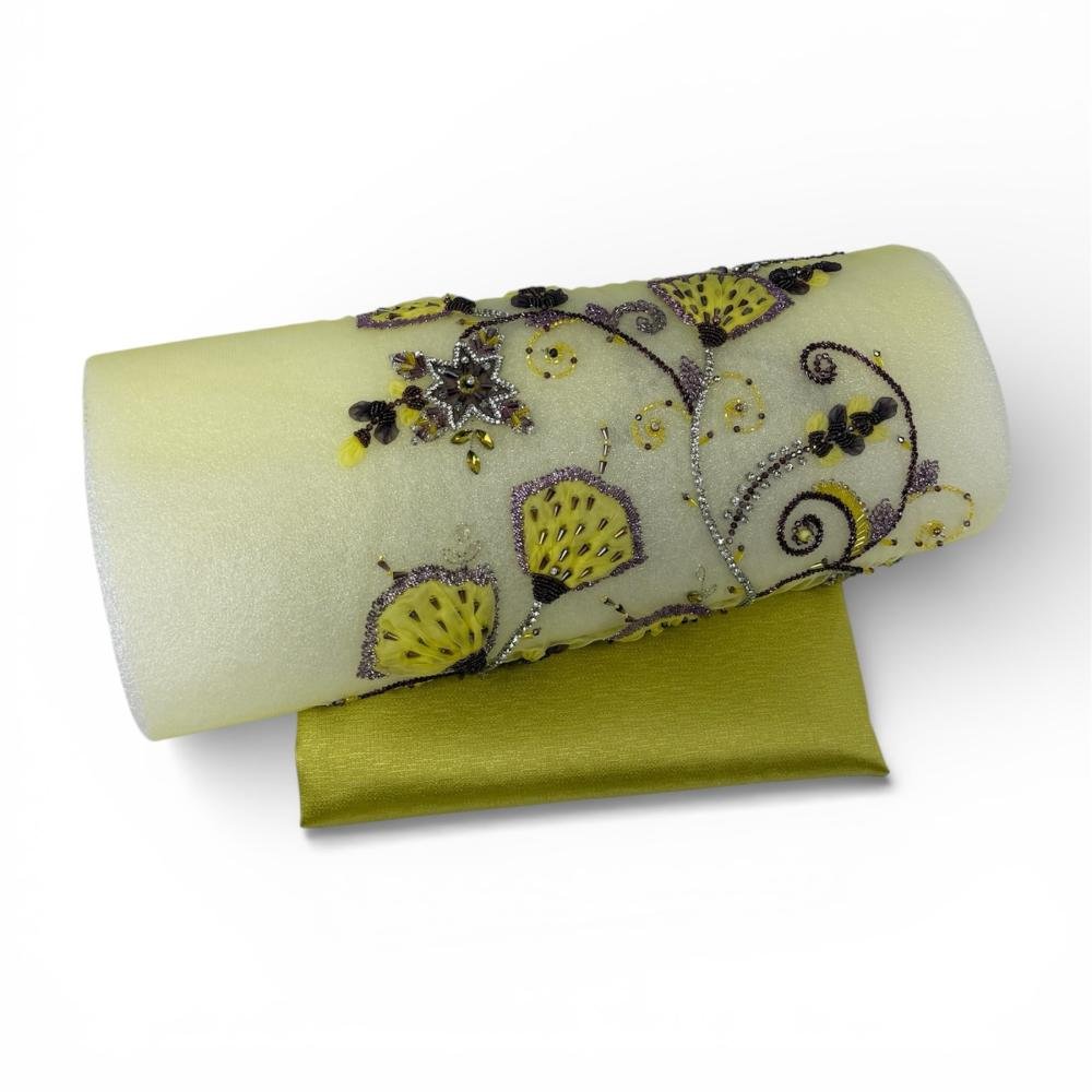 قطعة فاخر مزين بتطريز يدوي متقن يضفي لمسة من الأناقة والرقي على التصميم. يتميز القماش بقوام متوازن وانسيابية أنيقة تمنحه حضورًا فخمًا، مما يجعله خيارًا مثاليًا لتنفيذ فساتين السهرة والقطع الراقية التي تتطلب تفاصيل مميزة وجودة عالية.