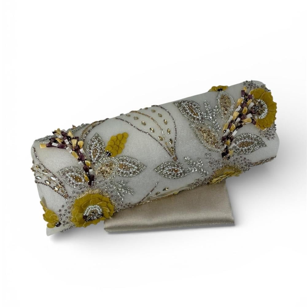 قطعة فاخر مزين بتطريز يدوي بالخرز والكرستال متقن يضفي لمسة من الأناقة والرقي على التصميم. يتميز القماش بقوام متوازن وانسيابية أنيقة تمنحه حضورًا فخمًا، مما يجعله خيارًا مثاليًا لتنفيذ فساتين السهرة والقطع الراقية التي تتطلب تفاصيل مميزة وجودة عالية.