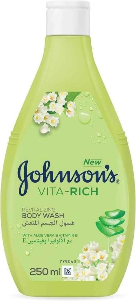 جونسون فيتا ريتش غسول الجسم بزهور البرتقال والياسمين والموجيت، 250 مل، غسول الجسم المنعش، ينظف بشرتك بينما يمنحها رطوبة ونعومة، غني بالألوفيرا والفيتامين E، مناسب لجميع أنواع البشرة حتى الحساسة