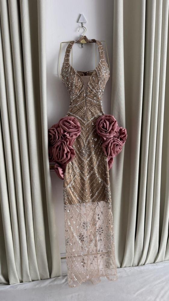 فستان سهرة فاخر بتصميم نحتي يبرز الأنوثة، مطرّز بالكامل بتفاصيل لامعة على قماش نيود راقٍ، مع ورود ثلاثية الأبعاد بلون وردي غامق تضيف لمسة درامية فريدة. خيار مثالي لإطلالة ساحرة تخطف الأنظار في المناسبات الراقية.