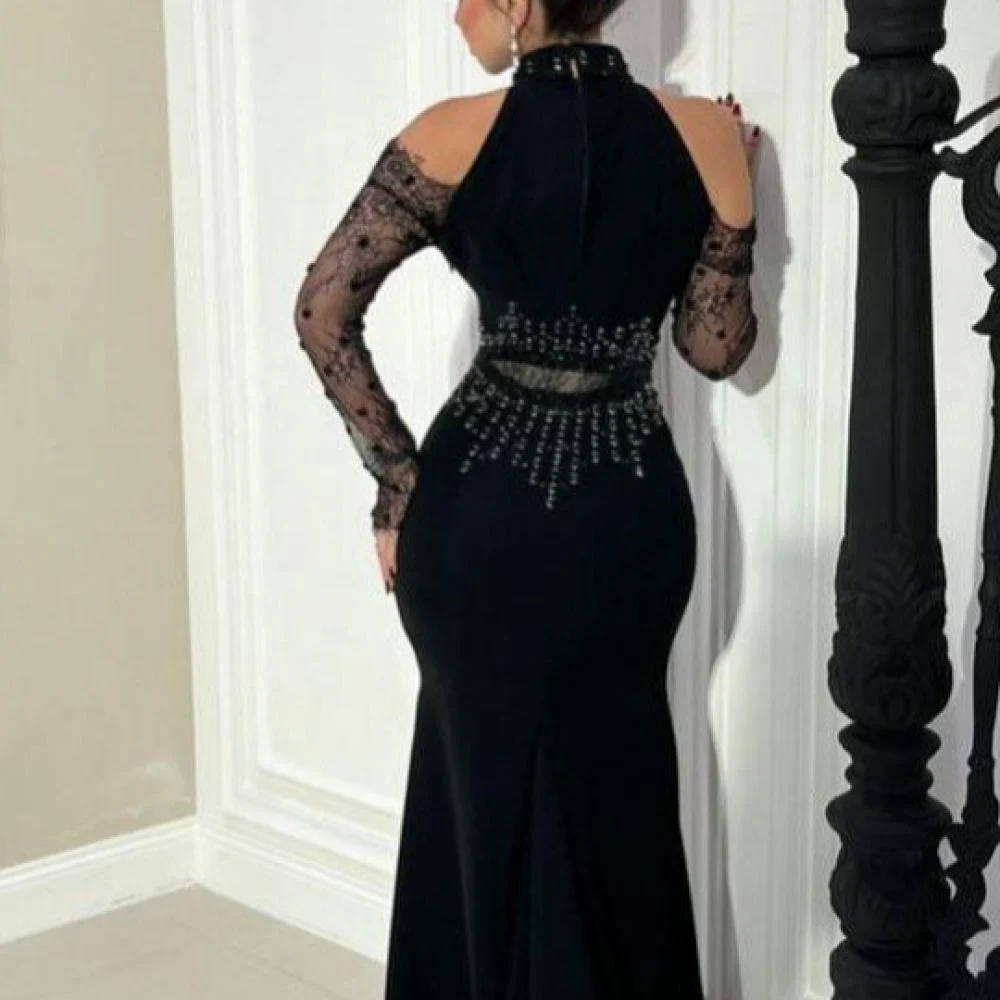 الجزء العلوي مصمم بياقة مرتفعة أنيقة مع فتحة خلفية ناعمة تكشف الظهر بأسلوب متوازن، ويبرز الخصر بحزام مدمج مطرّز يدويًا بحبيبات لامعة دقيقة تضيف لمسة فخامة دون مبالغة.