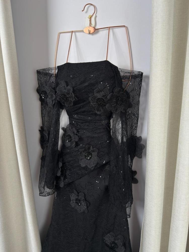 الأكمام طويلة ومنفذة من تل شفاف مطرّز، تضيف خفة وأناقة للإطلالة، مع امتداد ناعم للتطريز ينسجم مع تصميم الجسم الرئيسي للفستان. أما التنورة فتنحدر بخط مستقيم مائل قليلًا، ما يمنح حركة أنيقة وانسيابية راقية عند المشي.