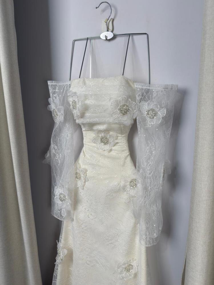 الأكمام الطويلة الشفافة مصنوعة من دانتيل خفيف مزخرف بتطريزات زهرية ثلاثية الأبعاد، تتوسطها حبات خرز دقيقة ولمسات لؤلؤية تضيف بريقًا هادئًا وفخمًا دون مبالغة. القصة الكاملة للفستان محددة بانسيابية لتبرز القوام بأسلوب أنثوي راقٍ دون ضغط أو تكلف.