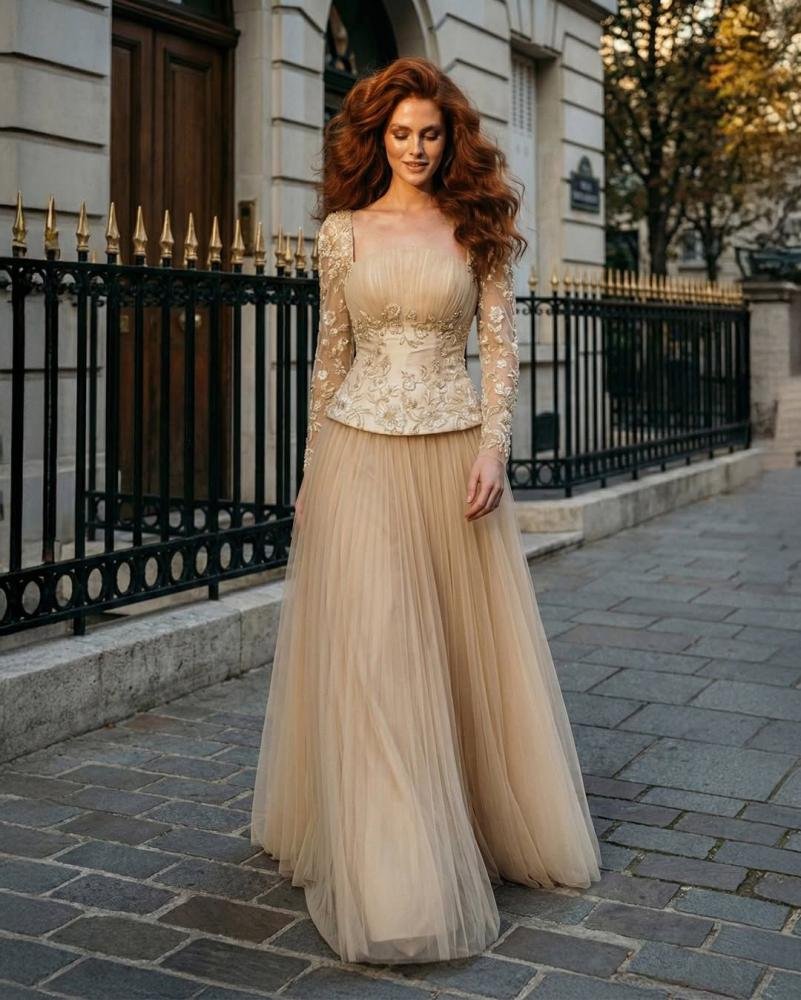 فستان بلون الشامبانيا الدافئ، ينبض بأنوثة هادئة ويعكس ذوقًا رفيعًا، مصنوع من طبقات التل الناعم التي تنسدل بخفة وانسيابية لتمنحك حركة حالمة مع كل خطوة. الجزء العلوي مصمّم بدقة عالية، مزدان بتطريزات فاخرة مستوحاة من الزخارف الكلاسيكية، تتناغم مع أكمام شفافة مطرزة تضيف لمسة ملكية ناعمة.