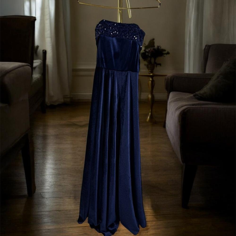 فستان سهرة أنيق بتصميم يفيض فخامة، بلون كحلي عميق يعكس الرقي والهدوء مع لمسة ملكية لافتة. يأتي بقصة صدر ناعمة مزينة بتطريزات لامعة دقيقة تضيف بريقًا راقيًا دون مبالغة، بينما ينساب الجزء السفلي بانسيابية تمنح الإطلالة طولًا وجاذبية مع كل حركة.