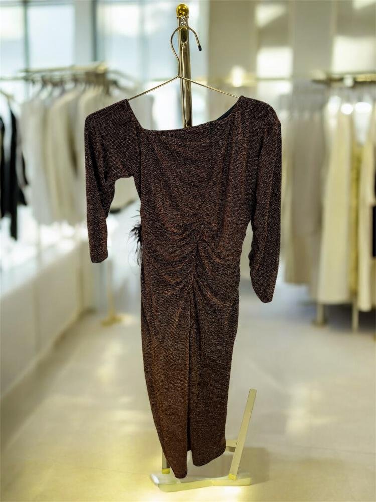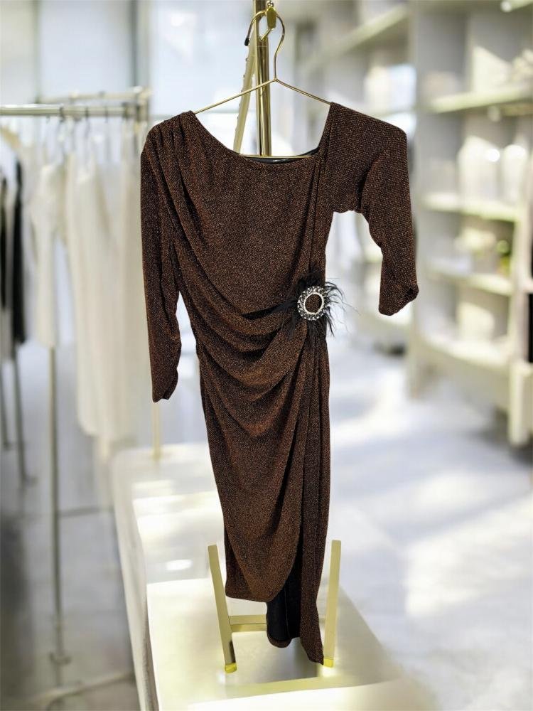 التفصيلة الجانبية مزينة بإكسسوار فاخر مرصع مع لمسة ريش ناعمة، ليكون عنصر جذب يضفي شخصية قوية ولمسة درامية راقية على التصميم. الأكمام بطول ثلاث أرباع تمنح توازنًا مثاليًا بين الاحتشام والتميز، والطول الأنيق يجعل الفستان خيارًا مثاليًا للسهرات الراقية والمناسبات الخاصة.