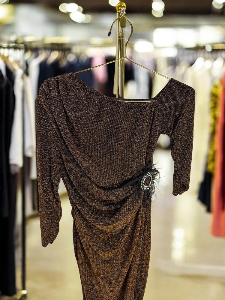 فستان سهرة بتصميم يجسد الجرأة الراقية والأنوثة العصرية، مصنوع من قماش لامع بنسيج غني يعكس الضوء بنعومة ويمنح الإطلالة حضورًا دافئًا وفخمًا. القصة غير المتناظرة تضيف لمسة فنية مميزة، بينما تنسدل الثنيات الجانبية بانسيابية لتبرز القوام بأسلوب أنثوي أنيق.