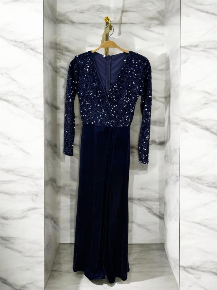 اللون كحلي عميق، راقٍ، يبتلع الضوء ثم يعيده على شكل وميضٍ ناعم من تطريزات لامعة متناثرة كسماءٍ صافية. الجزء العلوي مطرّز بالكامل، يحتضن القوام بثقة، وقصة الصدر المتقاطعة على شكل V ترسم أناقة أنثوية هادئة، جاذبة دون تكلّف.
