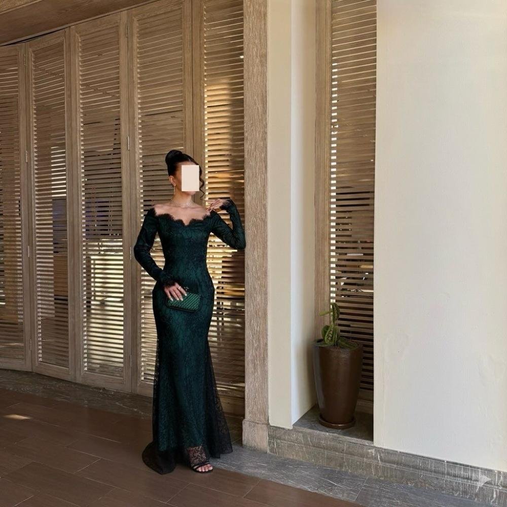 فستان سهرة دانتيل زيتي فاخر بياقة أوف شولدر فرنسية
