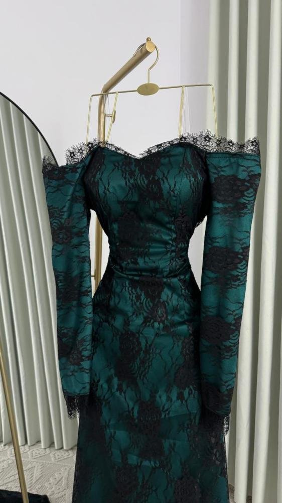 فستان يجسد الفخامة الهادئة، مصمم من أجود أنواع الدانتيل باللون الأخضر الزيتي العميق. يتميز بياقة “أوف شولدر” مزينة بحواف الدانتيل المشرشرة (Lace Trim) التي تمنحكِ لمسة فرنسية راقية، مع أكمام طويلة وقصة “ميرميد” تحدد تفاصيل القوام وتنتهي بذيل بسيط يضفي فخامة إضافية على إطلالتك.