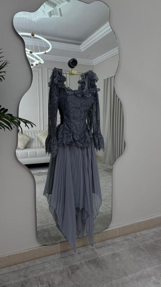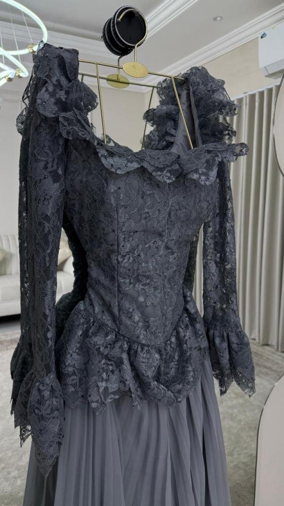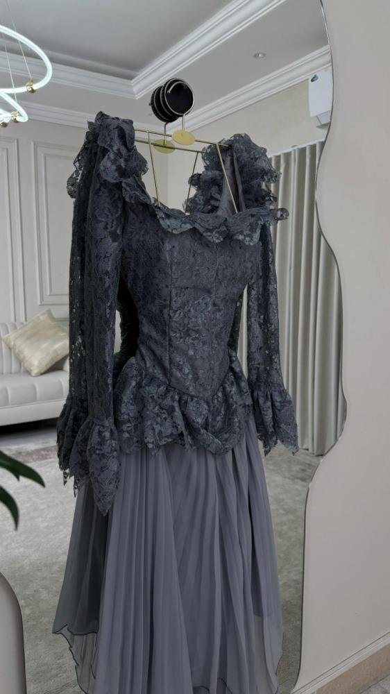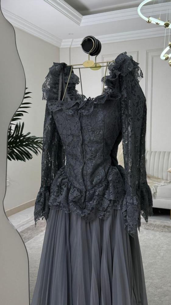 الجزء العلوي المصمم بإتقان يبرز جمال القوام، بينما تضيف الأكمام المزينة بالكشكش لمسة درامية أنيقة تعكس ذوقاً رفيعاً. أما اللون الرمادي الداكن فيمنحك فخامة هادئة تناسب السهرات الراقية والمناسبات الكبرى.