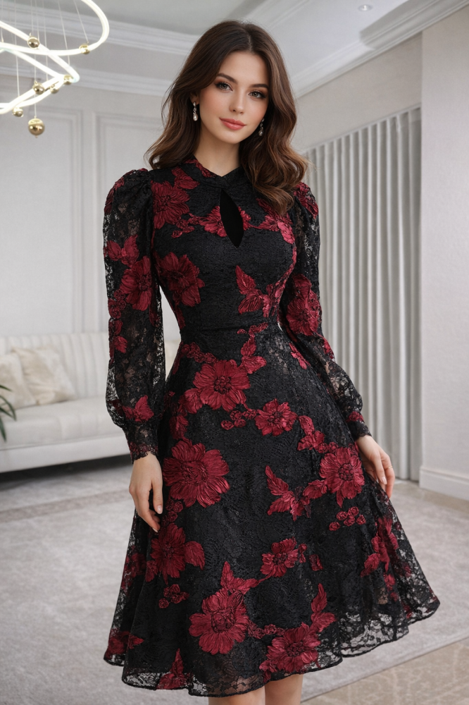 فستان ساحر يجمع بين فخامة الأسود الكلاسيكي ودفء الورود العنّابية بتطريز بارز يمنح التصميم عمقاً ملكياً لا يُقاوم. قماش الدانتيل الراقي ينساب بخفة وأنوثة، بينما يمنحك القصّ المحدد للخصر وتنورة الـ A-line حركة ناعمة وانسيابية تبرز جمال القوام بثقة.