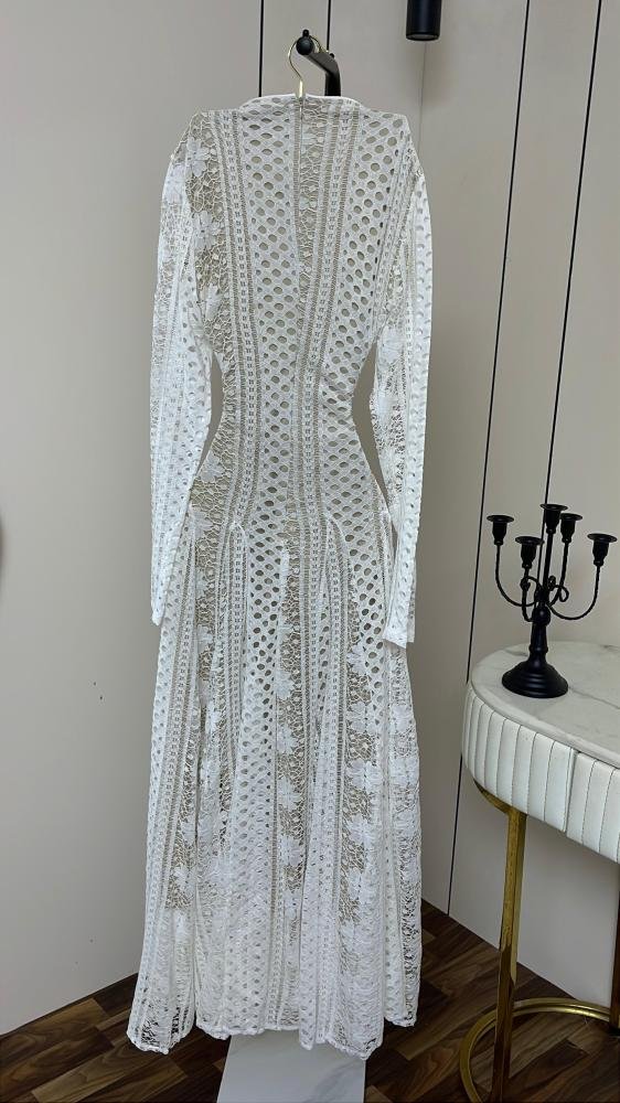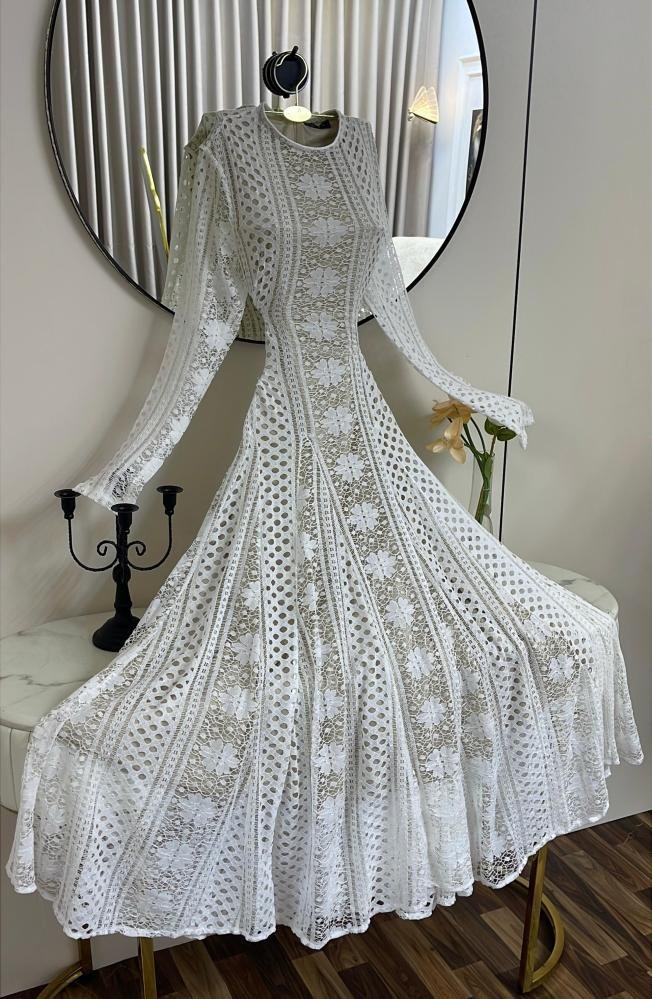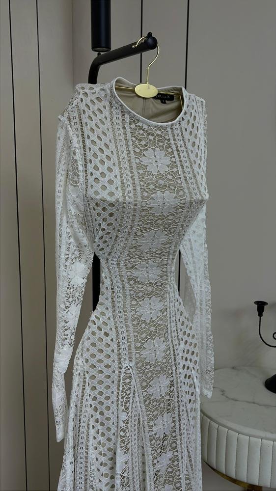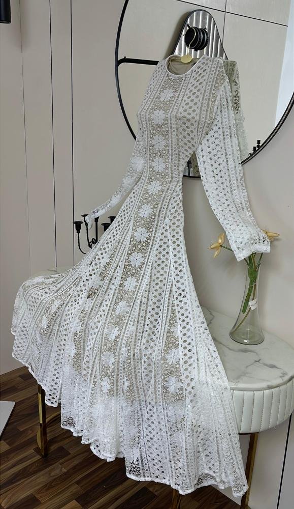 يتميز بقصّة انسيابية تنساب برقة مع الحركة، بينما تضيف النقوش الدانتيلية لمسة فاخرة تعكس ذوقاً رفيعاً. الأكمام الطويلة والتصميم المتوازن يمنحانك حضوراً هادئاً لكنه لافت، ليكون خياراً مثالياً للمناسبات الراقية، حفلات الخطوبة، أو الإطلالات التي تتطلب فخامة ناعمة.