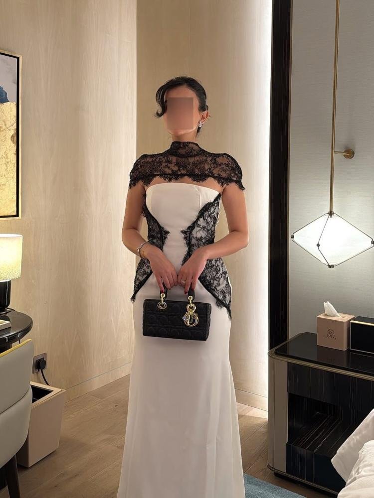 فستان سهرة كريب أبيض فاخر بتفاصيل دانتيل أسود فرنسي