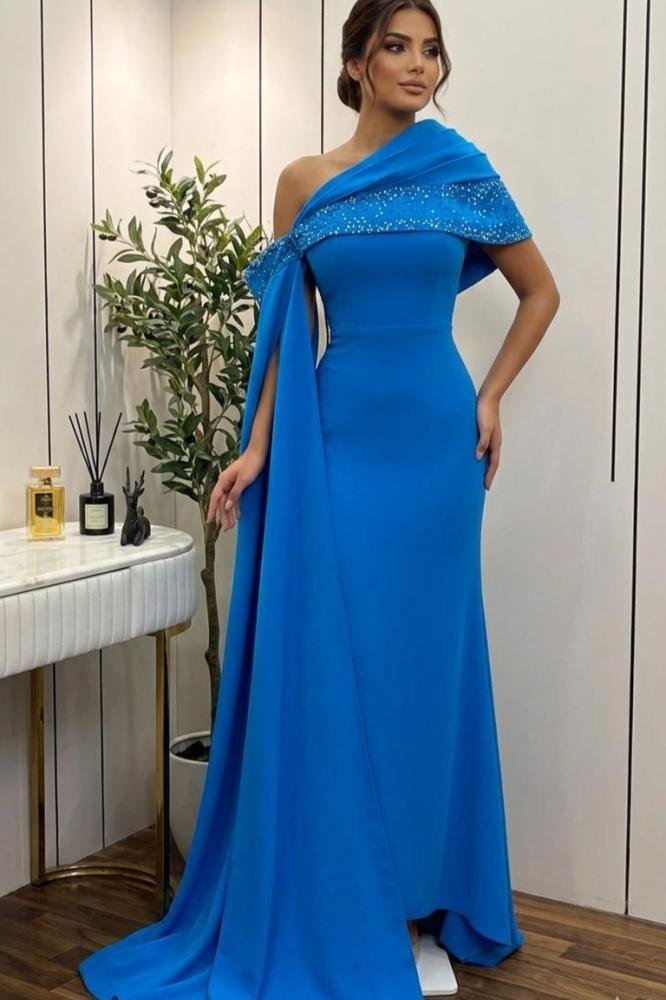 فستان سهرة أزرق ملكي طويل بكتف واحد مع شال