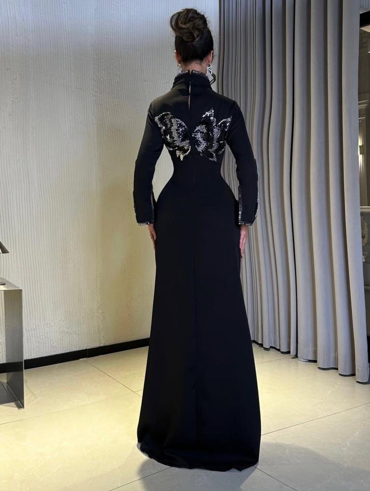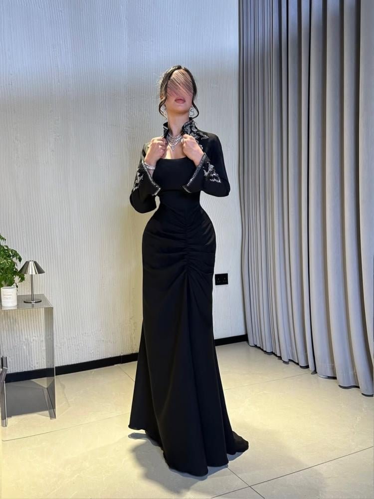 فستان سهرة أسود فاخر بزمزمة “درابيه” وأكمام مطرزة بالفضة