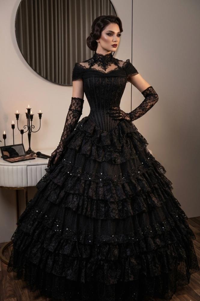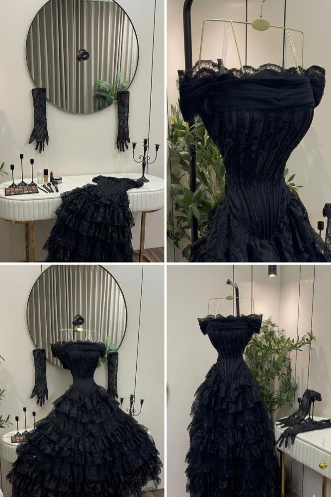 فستان سهرة أسود فاخر بتصميم أوف شولدر أنثوي، يتميز بكورسيه محدد يبرز القوام بأناقة، مع تنورة غنية بطبقات متعددة من الدانتيل الفاخر تمنح حجمًا دراميًا وحركة لافتة. تفاصيل القماش الناعمة ولمسات اللمعان الخفيفة تضيف فخامة راقية، مع قفازات دانتيل طويلة تكمل الإطلالة بأسلوب ملكي جذاب.