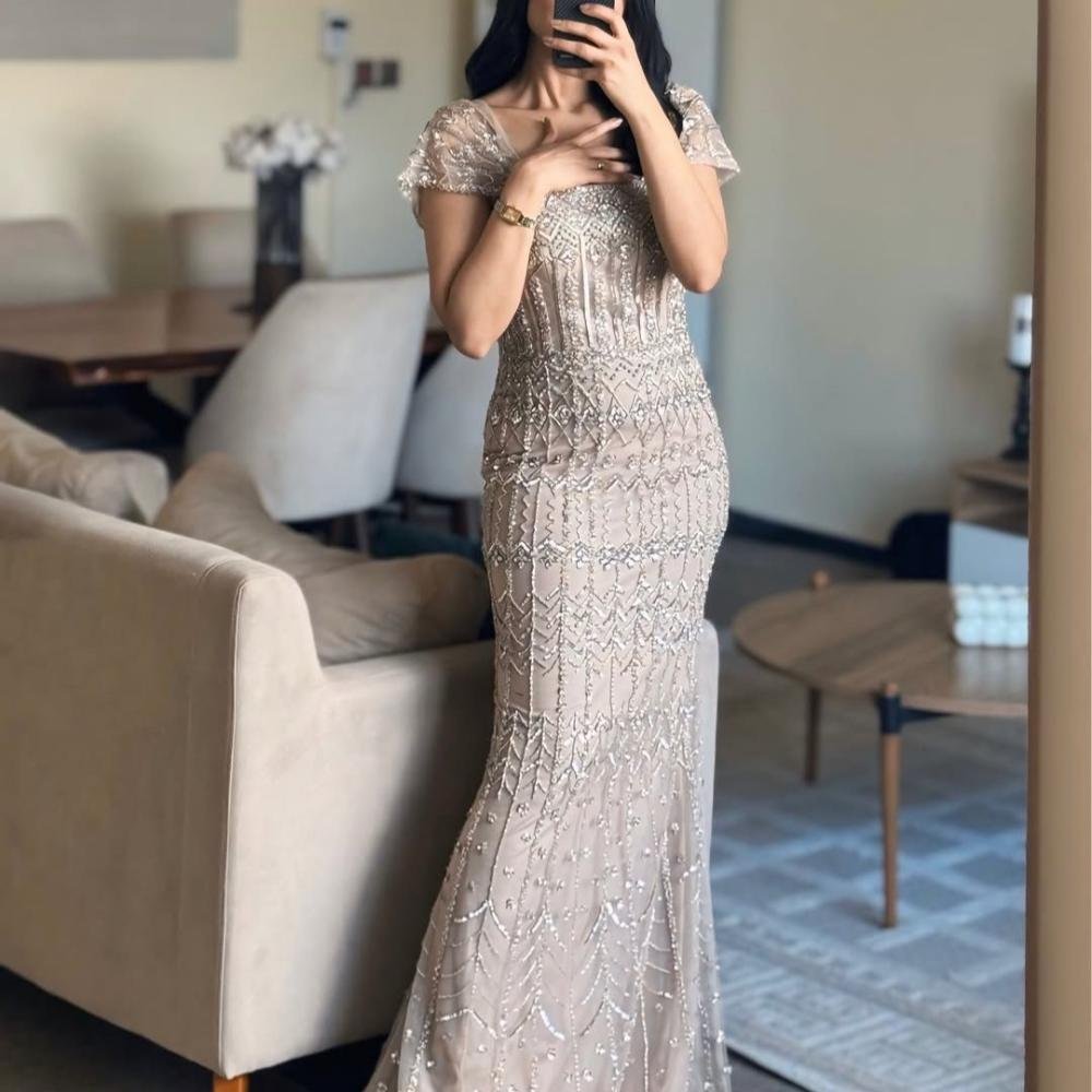 فستان سهرة أوف وايت مرصع بالخرز والترتر
