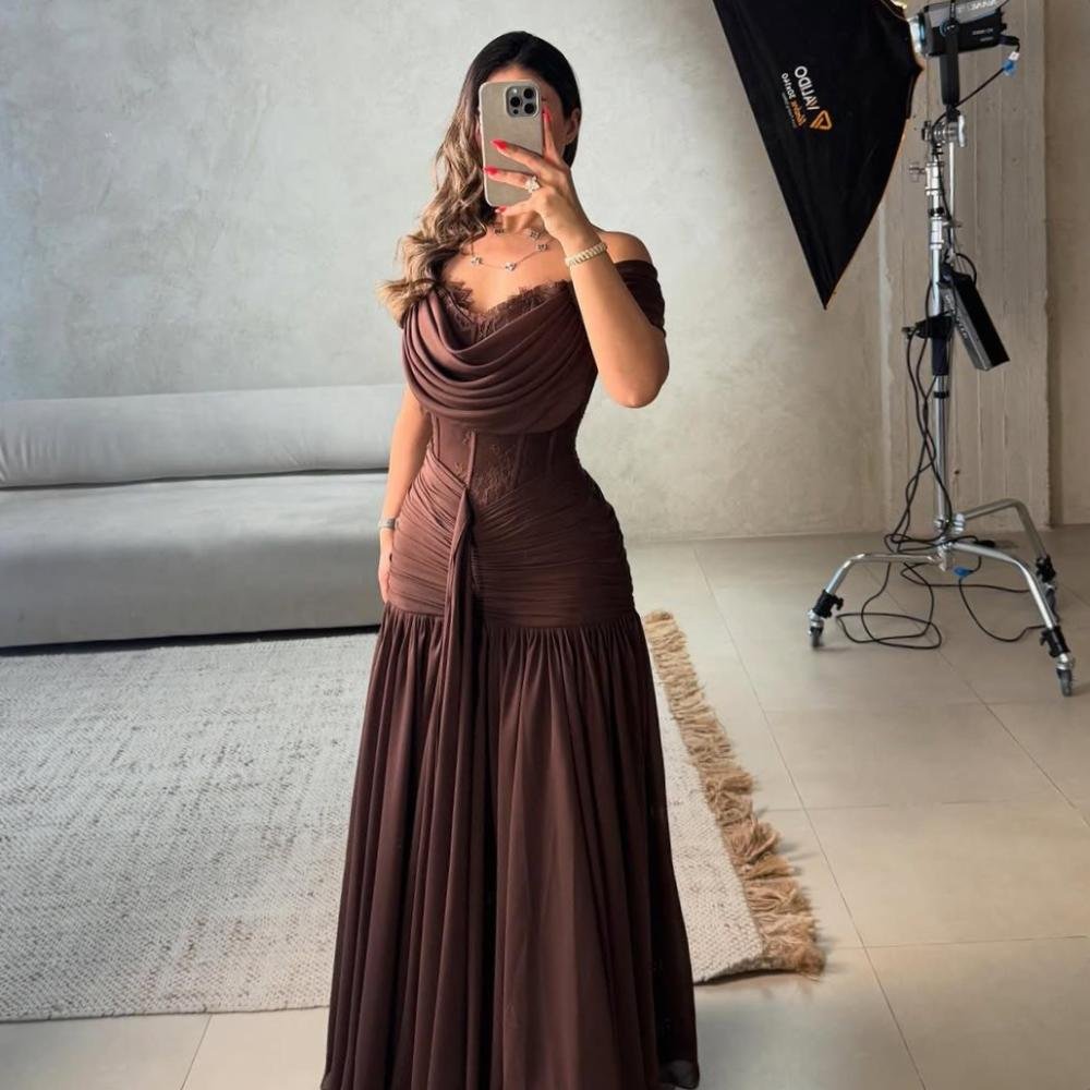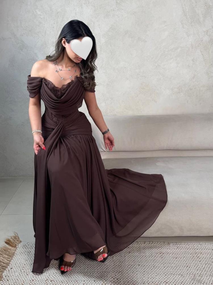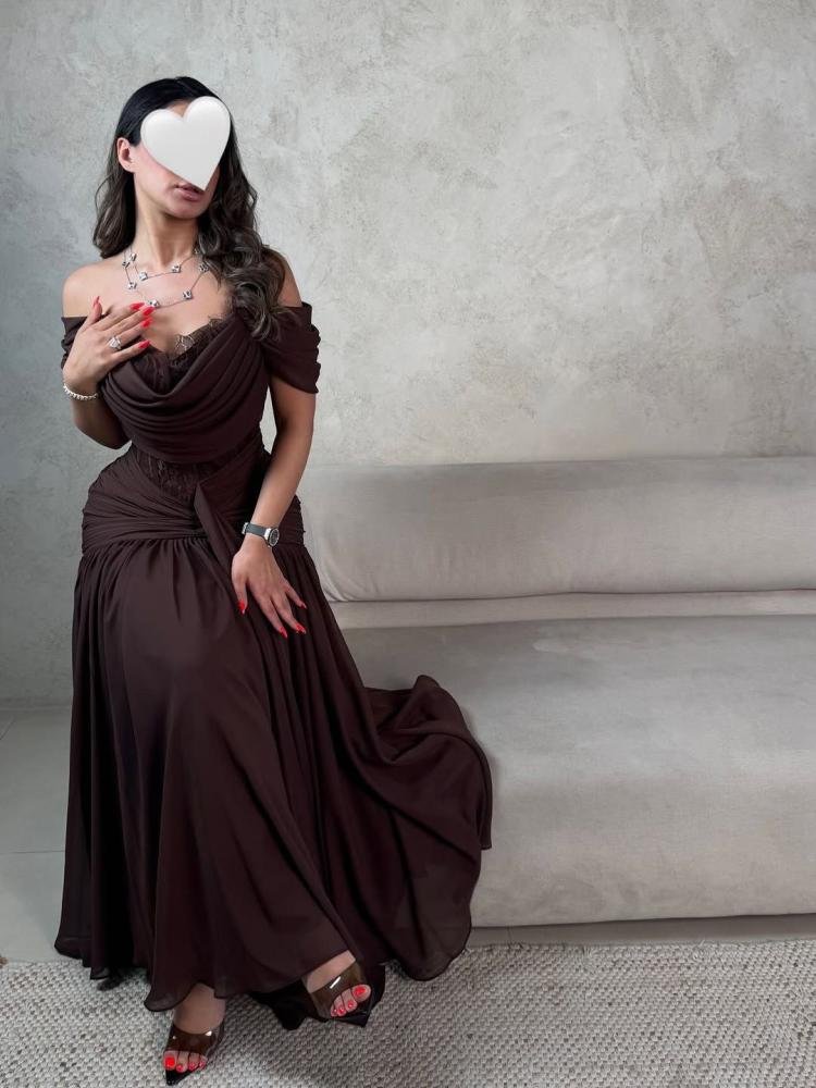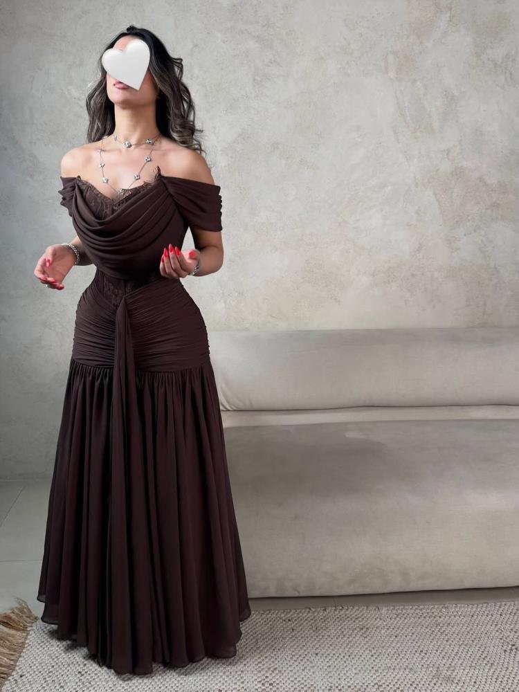 فستان سهرة “شوكولاتة” بياقة درابية وأكمام أوف شولدر فاخرة