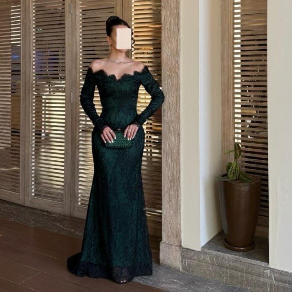 فستان سهرة فاخر بلون زمردي جذاب، تصميم أوف شولدر مع دانتيل راقٍ يبرز الأنوثة، وقصة انسيابية تحدد القوام بذيل خلفي ملكي يمنحك إطلالة فخمة في كل مناسبة.
